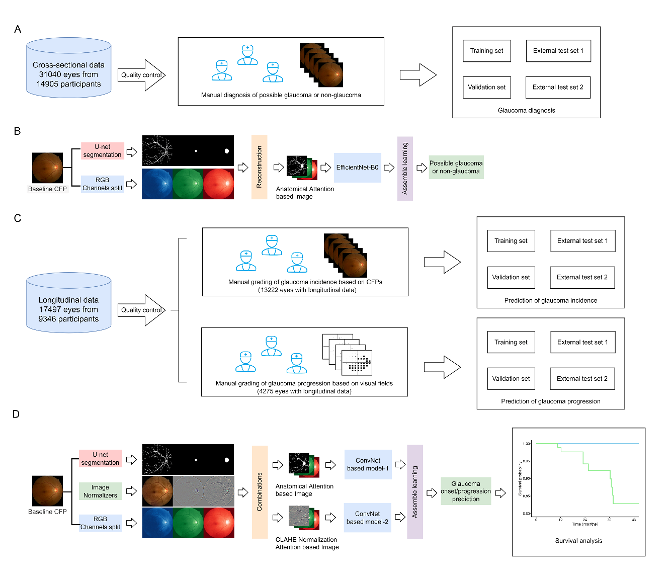圖1. 用于青光眼發病和進展預測的深度學習系統設計、驗證流程示意圖