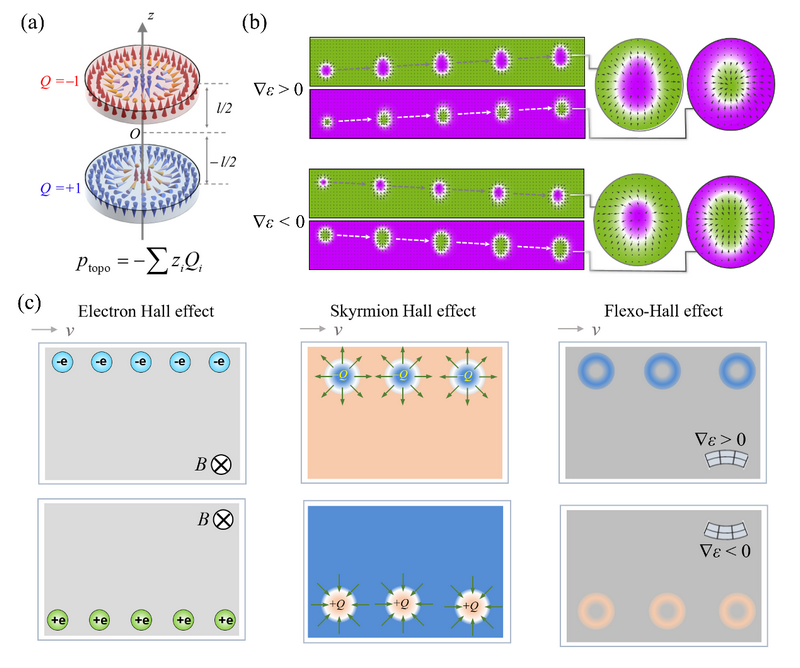 另外,該項研究還揭示了撓曲磁效應導致的奇異磁輸運特性。研究人員在理論上證明了應變梯度下斯格明子反常的霍爾偏轉來源于應變梯度作用誘導的幾何馬格努斯力,并將這種反常的磁結構偏轉命名為撓曲霍爾效應(Flexo-Hall Effect)。該工作預測的撓曲磁效應強度比以往的理論預測高出4個量級,使得納尺度下的磁彈效應中由撓曲磁效應貢獻的部分比傳統壓磁、磁致伸縮效應的貢獻高出1-2個量級,為撓曲磁效應在器件應用上提供了新思路。