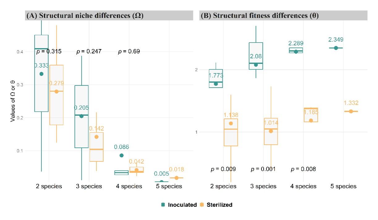在獲得內稟增長率和相互作用系數矩陣后,利用結構化共存方法估算了兩物種至五物種群落的結構化生態位差異(Ω)和結構化適合度差異(θ),以評估土壤微生物對多物種共存的影響。結果顯示(圖2),土壤微生物顯著影響多物種群落的結構化適合度差異,而對結構化生態位差異的影響較弱。具體而言,土壤微生物顯著增加了所有植物群落的結構化適合度差異。例如,在兩物種群落中,土壤微生物使群落的平均結構化適合度差異增加了55.8%;在五物種群落中,這一增幅達到了76.4%。