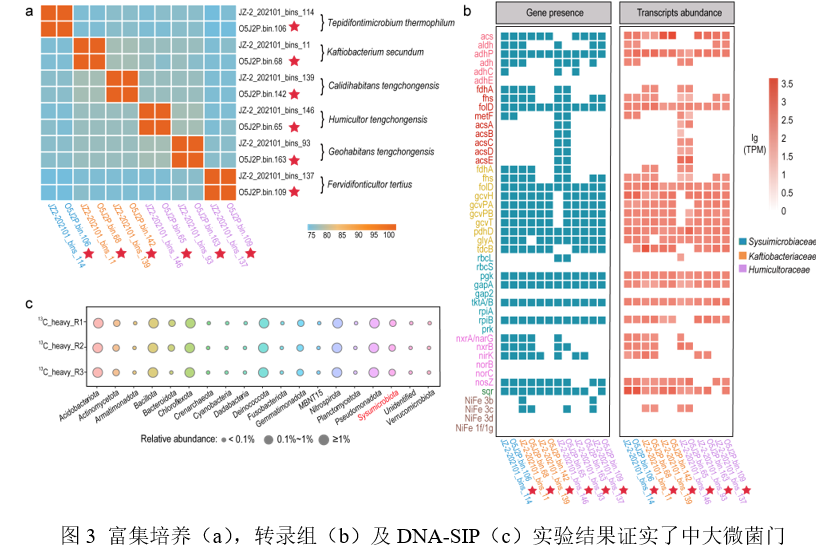 本研究從熱泉原始樣品的宏基因組數據中重構了CSP1-3類群的基因組,結合NCBI數據庫中的基因組,最終選取112條完整度大于80%,污染度小于5%的CSP1-3類群基因組進行分析。系統發育結果顯示,這112條基因組所代表的菌株屬于同一門,可劃分為5個不同的科,11個屬和25個種(圖1)。這些基因組所代表的菌株廣泛分布于世界各地,土壤和熱泉是適合該類群生存的生境(圖1)。基因組分析結果顯示,該門類群的菌株是兼性厭氧微生物,能通過還原性甘氨酸途徑(RGP)、卡爾文循環(CBB)和伍德-永達爾通路(WLP)進行碳固定實現自養生長,氫化酶的存在及硫化物的氧化是自養生長過程中主要的能量來源(圖2)。采用自養培養基在厭氧條件下對CSP1-3類群進行富集,熒光原位雜交(FISH)實驗及擴增子結果顯示,CSP1-3類群被成功富集且豐度有明顯的提高。同時,宏轉錄組及穩定同位素核酸探針(DNA-SIP)技術分析結果進一步證實了CSP1-3類群的化能自養功能(圖3)。進化分析表明,CSP1-3類群的祖先能通過RGP進行自養生長并產生乙酸,且該功能在該門類群之間進行垂直傳遞,而CBB、WLP和反硝化功能則是通過不同的水平基因轉移事件獲得(圖4)。最終,本研究將該門類群命名為中大微菌門(Sysuimicrobiota phy. nov.)。該研究通過多組學技術和富集培養手段,系統深入地探究了中大微菌門的多樣性,空間分布格局,參與的生態功能角色和進化歷史,拓展了對未培養細菌的認知,完善了熱泉微生物生態功能過程理論,也為極端環境微生物新資源的挖掘提供了一種可能的思路和策略。