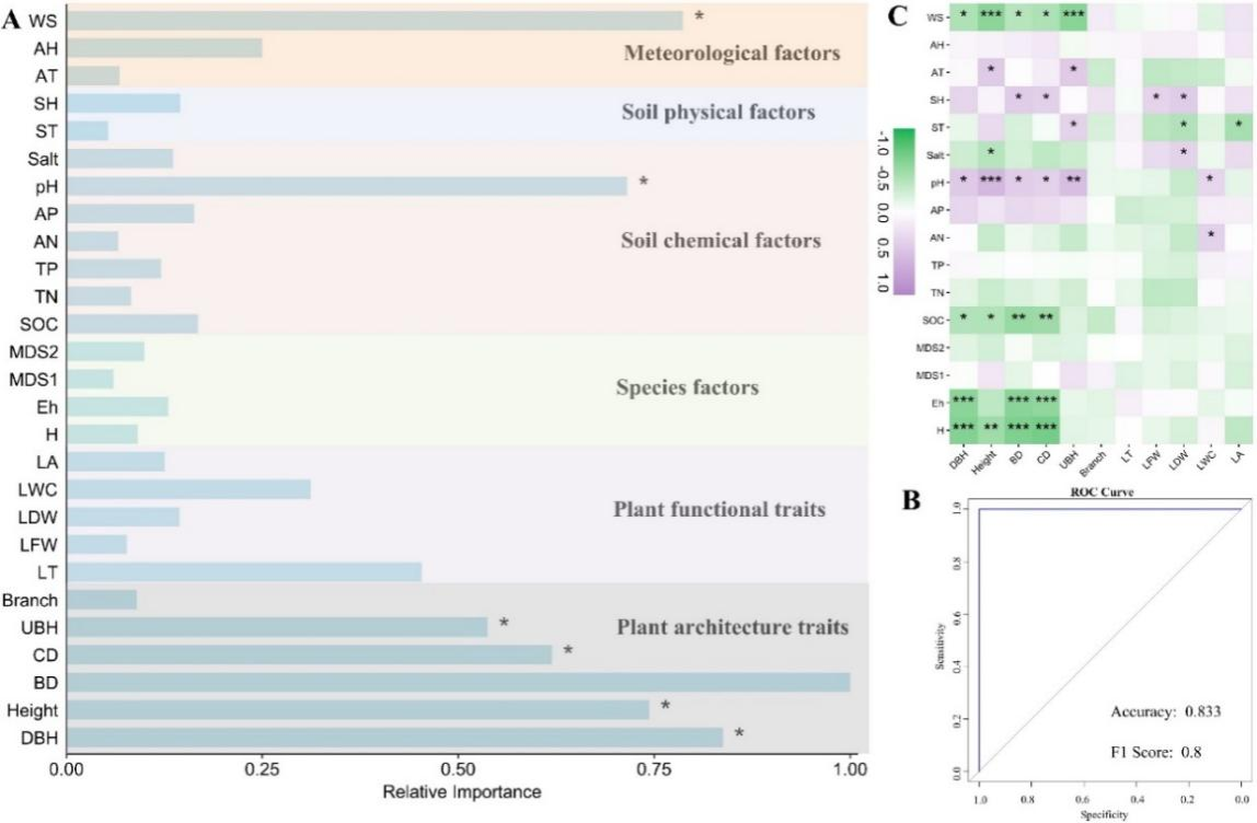 圖1各類變量對(duì)CDF和NCDF分類模型的相對(duì)重要性(A),分類模型的精度評(píng)價(jià)信息(B)以及植物性狀與其它因素的熱度圖(C)。