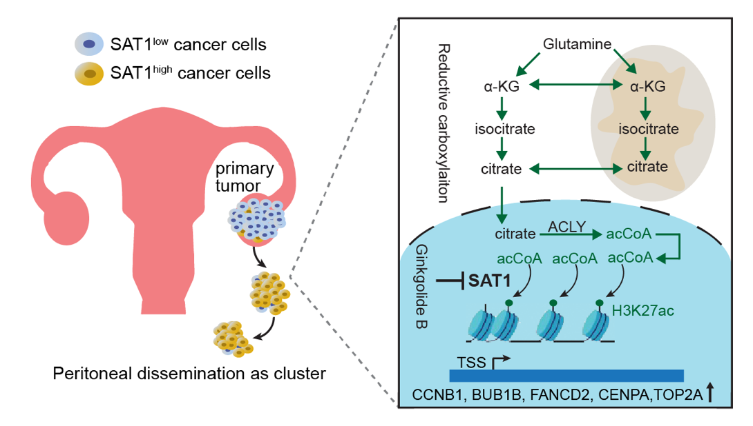 課題組研究發現,低氧誘導SAT1高表達,而SAT1通過促進腫瘤細胞非錨定生存,進而增強盆腹腔轉移。SAT1高表達的癌細胞在惡性腹水中普遍存在。SAT1通過直接乙酰化有絲分裂關鍵調控基因的H3K27結構域,提升其轉錄水平,進而保護非錨定的轉移細胞免于有絲分裂災難與細胞死亡。SAT1對H3K27的乙酰化作用,依賴于谷氨酰胺通過還原羧化途徑提供乙酰輔酶A。研究還發現,藥食同源的天然產物銀杏內酯B,可有效抑制SAT1活性,顯著降低小鼠模型中的轉移性腫瘤負荷。
