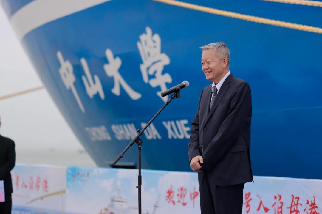 為了迎接“孩子”回家,下午3時,中山大學在碼頭舉行了簡潔而莊重的入泊母港歡迎儀式。活動由中山大學副校長蘭平主持,中山大學黨委書記陳春聲,中科院院士、中山大學校長高松,珠海市金灣區委書記梁耀斌,涉海學院師生代表,相關職能部門負責人、工作人員出席。