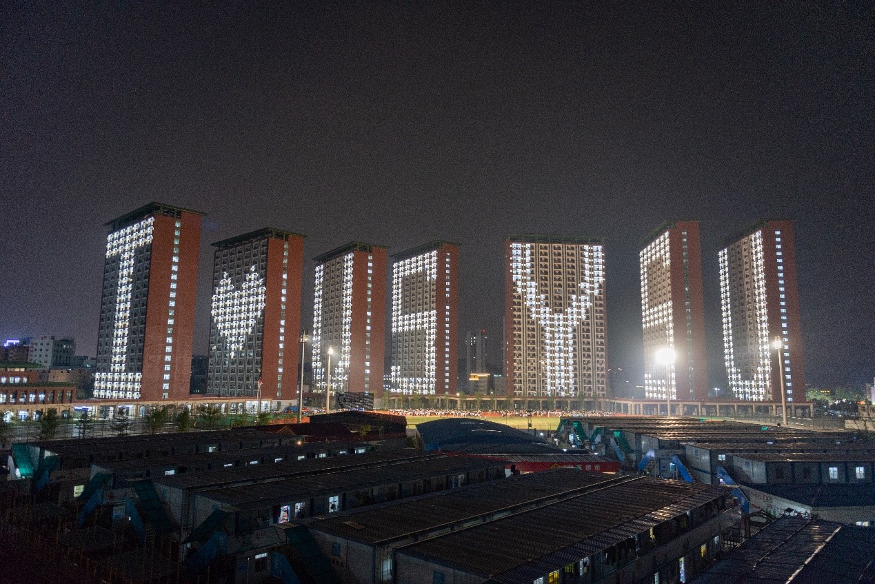 全體學(xué)生合唱《中山大學(xué)校歌》,每棟宿舍樓一側(cè)樓面超過280個(gè)宿舍房間同時(shí)亮燈,七棟宿舍樓順次形成I?USYSU(我愛你中山大學(xué))七個(gè)字樣。隨著《山高水長(zhǎng)》歌聲響起,生活區(qū)、運(yùn)動(dòng)場(chǎng)、食堂、坪石路、逸仙大道、教學(xué)樓的燈光依次亮起,校園里呈現(xiàn)出美輪美奐的視覺盛宴。師生們揮舞五星紅旗,鼓掌歡呼,儀式在《歌唱祖國》的歌聲中圓滿結(jié)束。