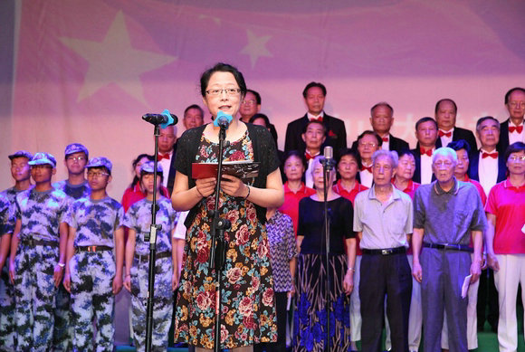 國亞萍代表學校向抗戰老戰士致敬,向參加音樂會的老同志表示感謝,向全校離退休教職工致以節日慰問。她表示,這場音樂會是一場具有特殊的重要意義的盛會。根據中央的有關部署,我校開展了以“銘記歷史、緬懷先烈、珍愛和平、開創未來”為主題的系列紀念活動,包括組織紀念抗戰勝利老同志書畫展、抗戰影片展播、慰問抗戰老戰士、發放抗戰紀念章、組織觀看大閱兵直播、參觀抗戰紀念館、抗戰老戰士講黨課等,目的就是要弘揚抗戰精神,扎實推進學校的愛國主義教育和社會主義核心價值觀的教育,為辦人民滿意的教育,實現民族復興的“中國夢”而共同努力奮斗。此外,國亞萍與抗戰老戰士、離退休人員、青年學生一起演唱了音樂會第一章中的《大刀進行曲》。