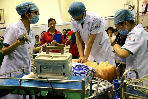 選手們在高度仿真的“模擬人”病例上進行操作