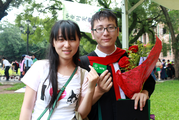 資訊管理學(xué)院的本科畢業(yè)生王珊珊和蔡偉忠,一起領(lǐng)取了愛情時(shí)光囊。王珊珊來自河北,蔡偉忠家在廣東,正應(yīng)了那句“萬水千山總是情”。王珊珊在談到自己的男朋友時(shí)說道,“偉忠最讓我感動的一件事情是他陪我去中山派發(fā)調(diào)查問卷,雖然遭到一些路人的冷眼相待,但是偉忠一直陪伴在我的身邊,讓我真的覺得很感動、很幸福!”
