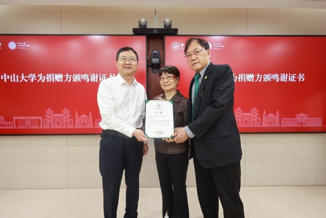 中山大學校長高松院士向陳運河、劉修婉校友伉儷頒鳴謝證書
