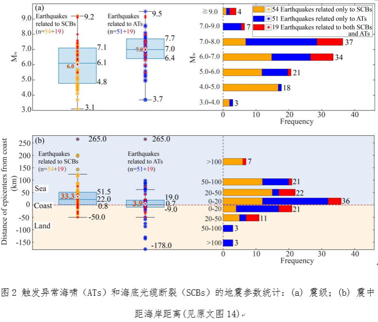 在新建立的全球 1900 年以來地震觸發的海底滑坡數據庫中,值得重點關注的是:南海及其周緣是地震觸發海底滑坡事件的高發區域。發生在南海及其周緣的事件達 51 起,全球占比 41%,空間上主要分布在南海東部中國臺灣省、呂宋海峽和菲律賓等海底光纜分布密集的區域(圖 4)。