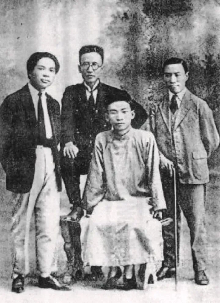 1926年,接任外國文學系系主任一職的郁達夫與郭沫若等教授在國立廣東大學(從左至右為王獨清、郭沫若、郁達夫、成仿吾)